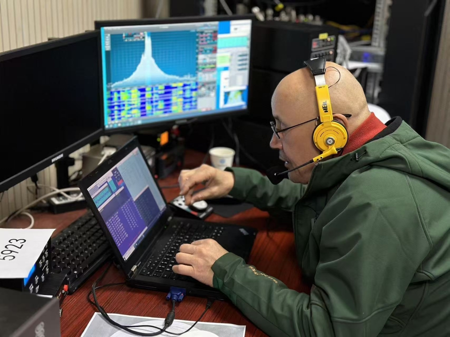 她蹲在铺着蓝色防水布的地面上,面前摆着PVC水管、金属卷尺、导线和电烙铁,手里正拿着一根水管向同学们演示:“咱们先把卷尺固定在水管上,金属卷尺能当导体,接收信号的效果特别好。”她用指尖捏着卷尺边缘,轻轻地调整角度,随着动作微微晃动。有同学伸手想帮忙固定,她笑着递过胶带:“慢慢来,胶带要缠得均匀,不然影响信号接收哦。” 夜晚寒风袭人,吴嘉珊却浑然不觉,她手里拿着焊好的导线,滔滔不绝地向大家讲解原理,双手还不时配合比画着,一会儿模拟电磁波传播的轨迹,一会儿演示信号解算的过程。“自制天线作为信号接收的载体,基于麦克斯韦电磁理论,当电磁波传播到天线附近时,其电场会在天线导体中感应出高频电流。”她的指尖顺着导线一路滑到接口处,“感应出的电流通过这条信号线输入到信号接收装置,经过放大和解调,就能还原出声音、图像这些原始信息啦。”声音清亮,条理清晰,丝毫不怯场。围在她身边的同学们频频点头。聊到兴起时,有同学忍不住问她:“你这么懂无线电,到底为什么喜欢呀?” 吴嘉珊的眼里闪着光:“其实也没什么复杂的,我觉得咱们这一代年轻人,如果喜欢无线电,都想认认真真地玩吧。” 三 “火腿”通联,乐趣无穷 业余无线电爱好者素有“火腿”之称(英语Ham)。这次活动中,既有初入门径的“新火腿”,也有深耕多年的“老火腿”。业余无线电专家盛永俭今年60岁,已是退休的年龄。学生们都喜欢问他各种问题。这个圈子里,大家都称呼对方呼号,盛永俭的呼号是“BA1AJ”。